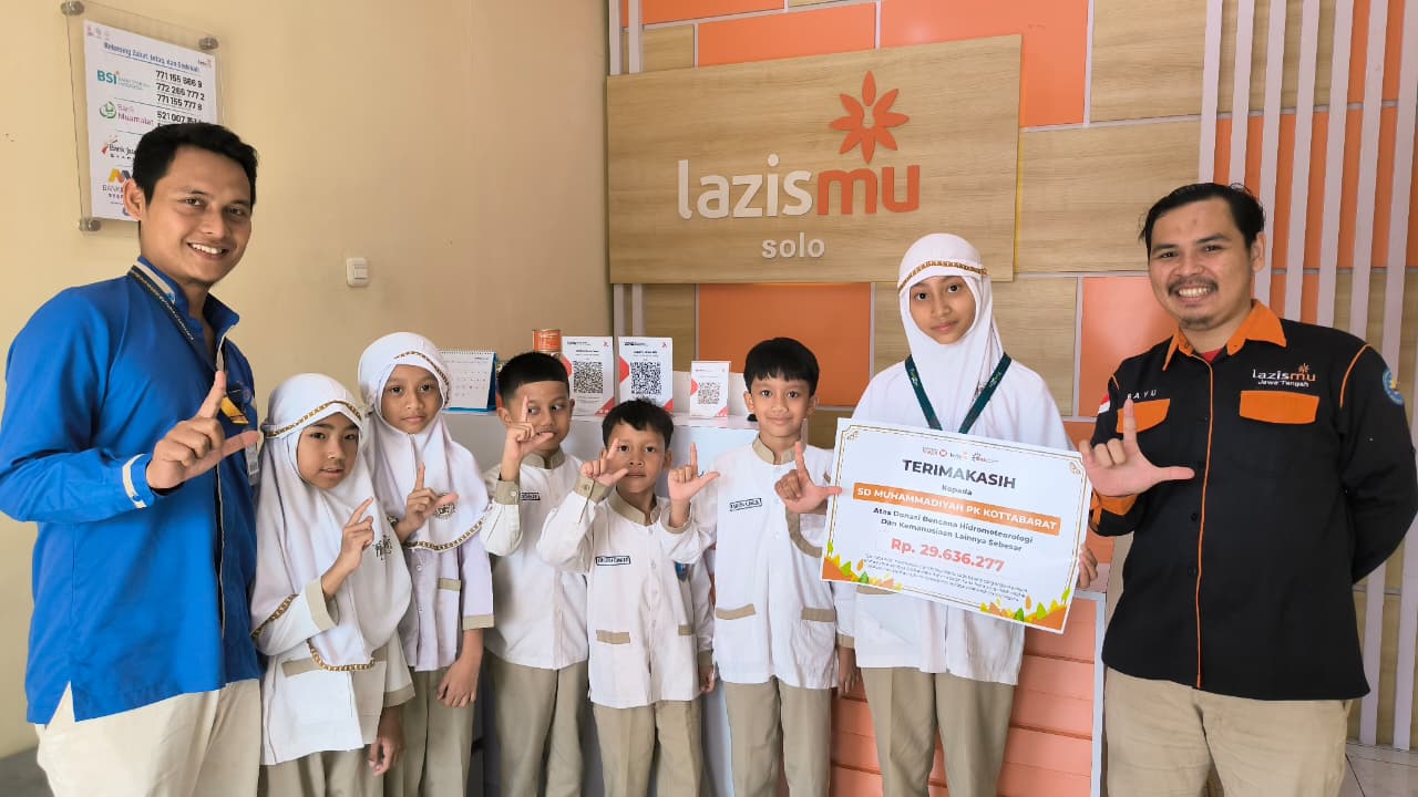 Sebanyak enam murid SD Muhammadiyah Program Khusus (PK) Kottabarat Solo menjadi perwakilan sekolah untuk menyerahkan donasi peduli bencana alam ke Kantor Lembaga Amil Zakat, Infaq dan Shadaqah Muhammadiyah (LAZISMU) Solo, Jl. Popda, Nusukan, Kec. Banjarsari, Rabu (10/12/2025).
